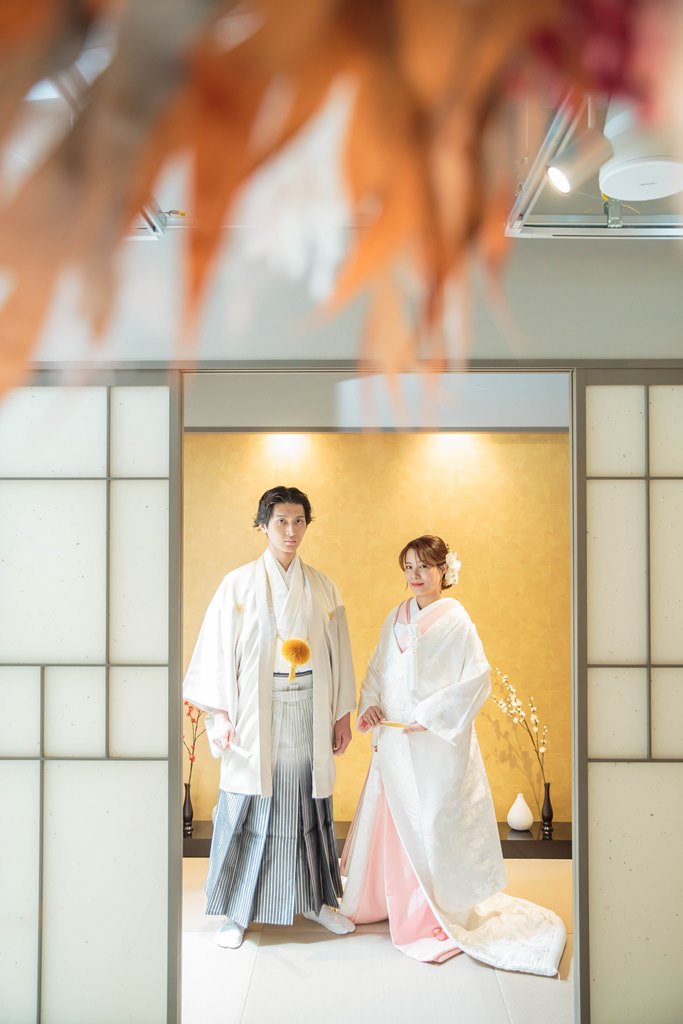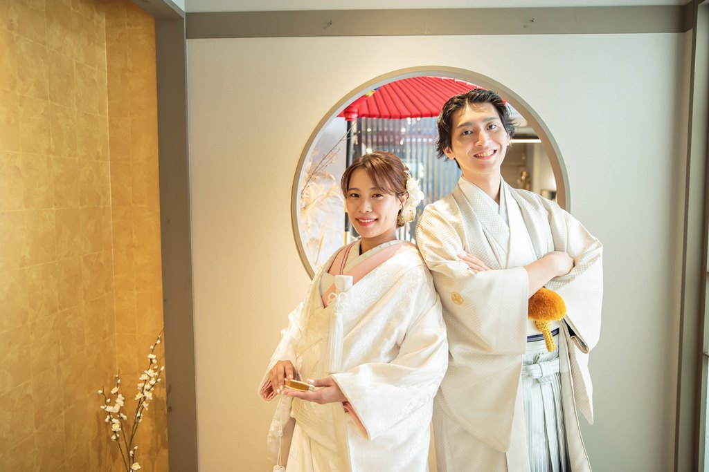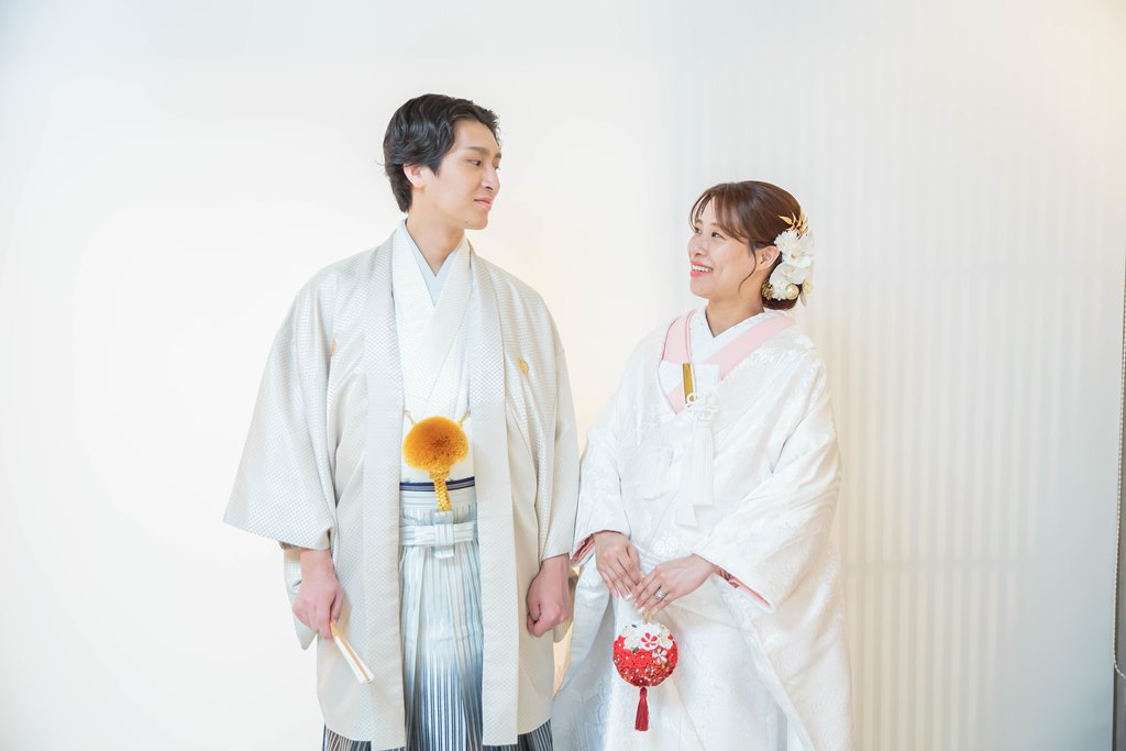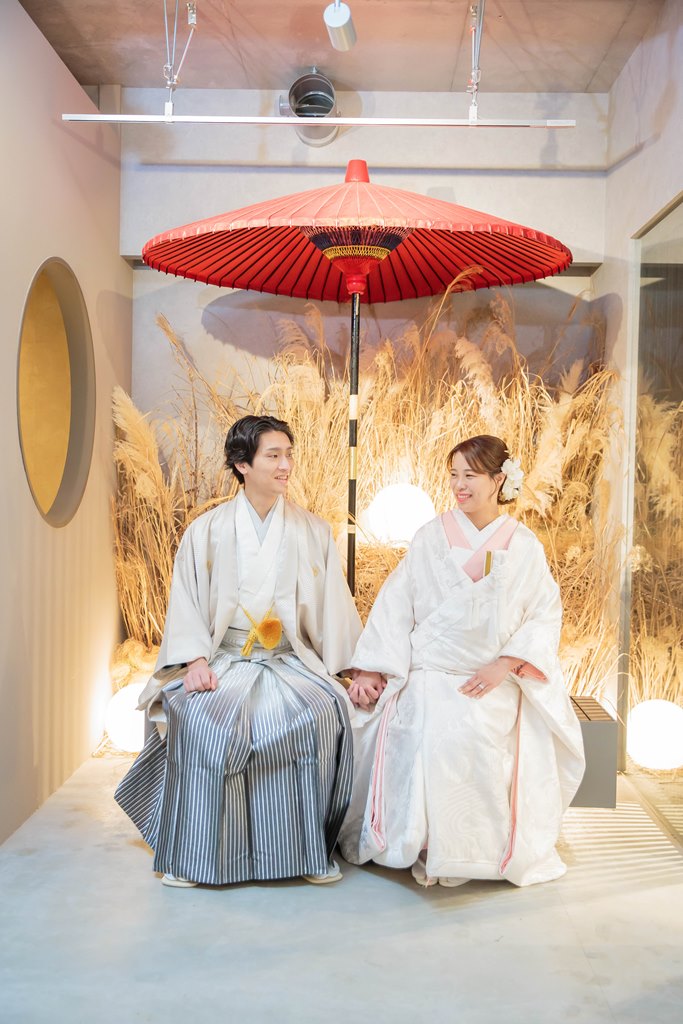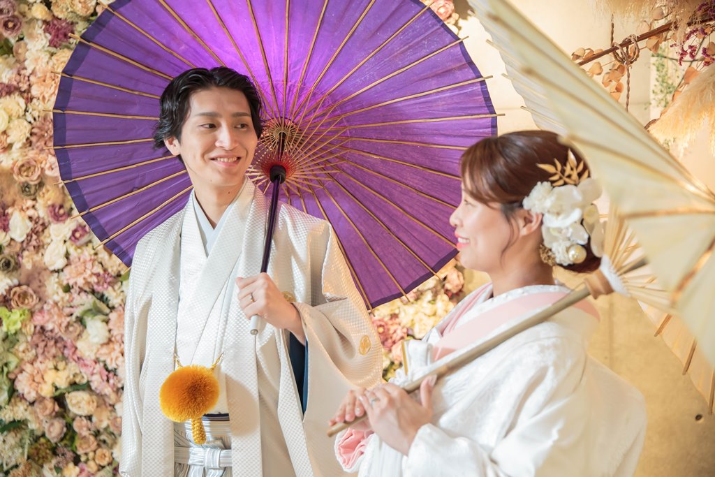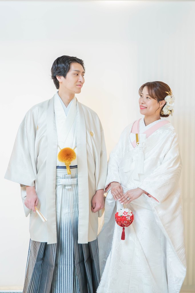 In the studio, you looked stylish in the classic white wedding kimono and the trendy light-colored formal attire, capturing your joyful expressions throughout the session.