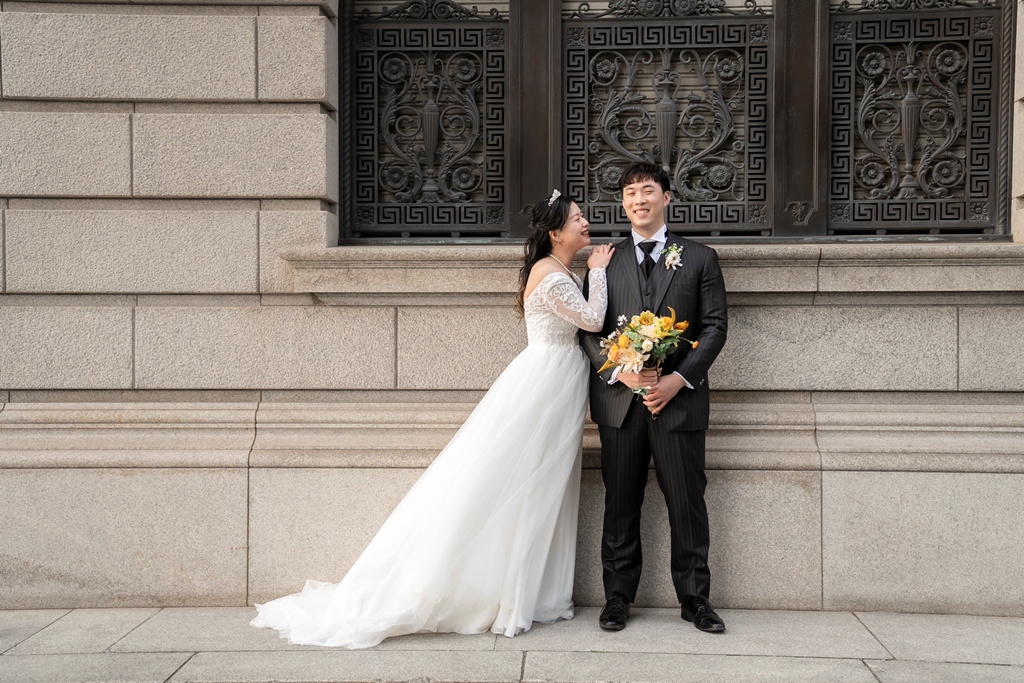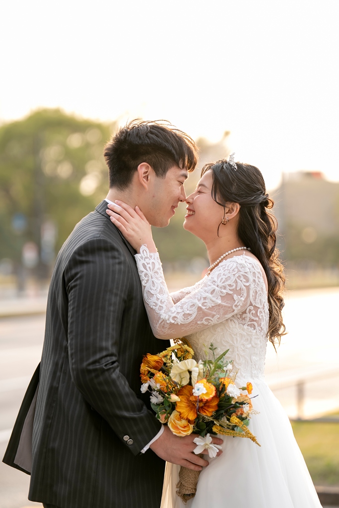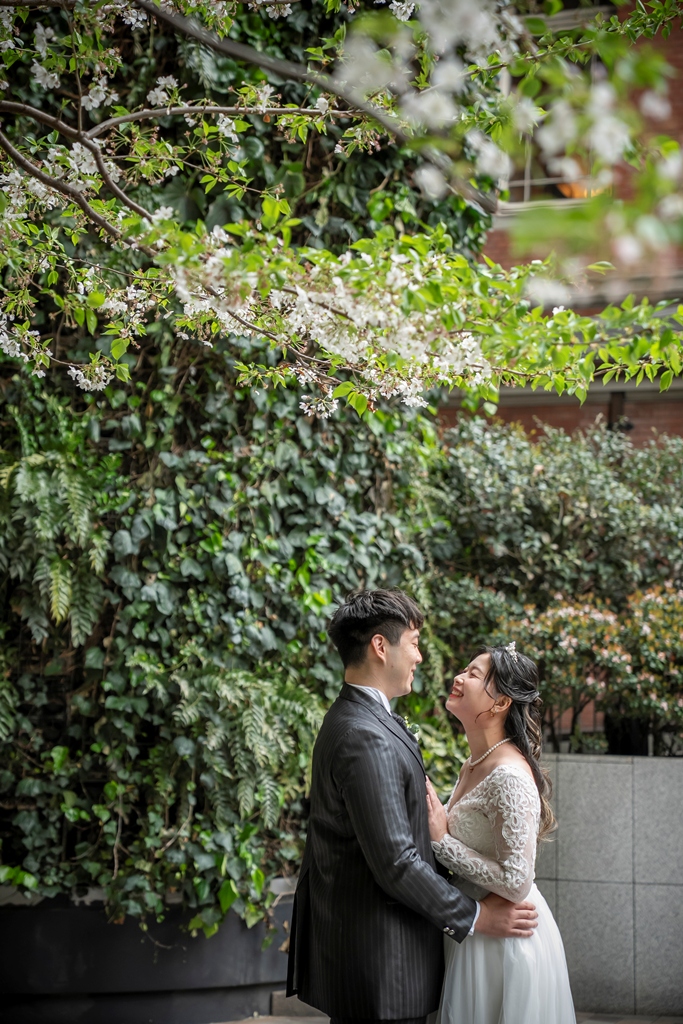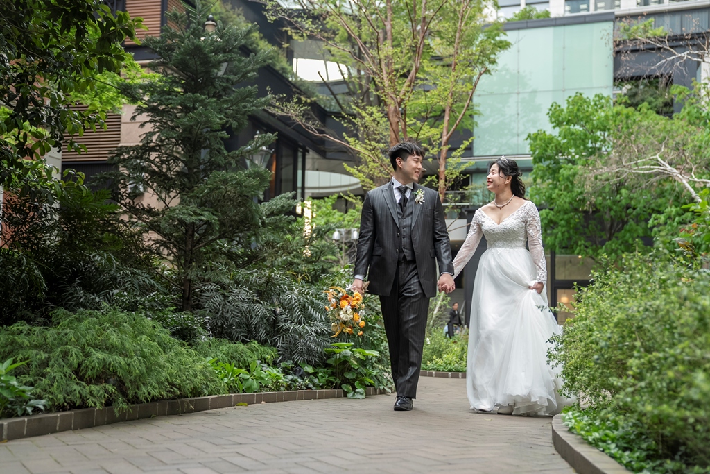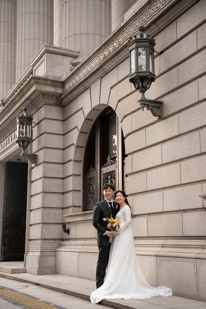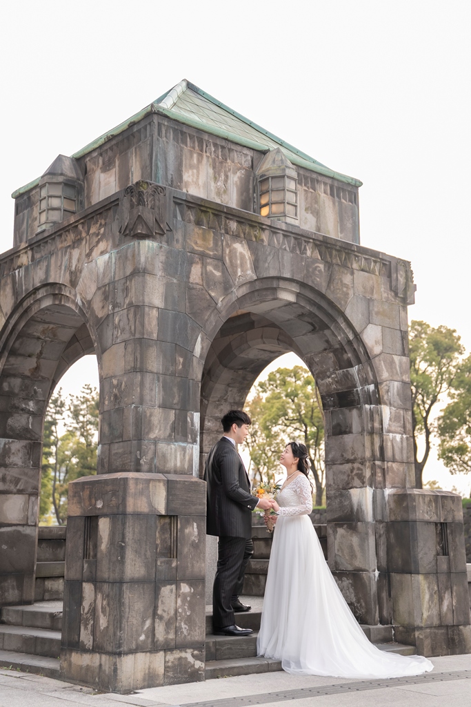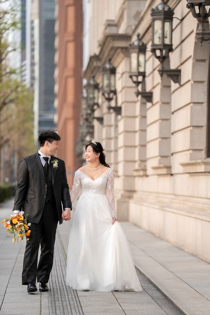 As the two of you walked hand in hand through this stunning cityscape, dressed in a graceful gown and sharp tuxedo, it felt like watching a love story unfold on a movie screen. Every glance, every gentle touch, every smile was filled with meaning. The historic charm of Tokyo Station and the sleek lines of Marunouchi beautifully framed your connection, turning each moment into a work of art.