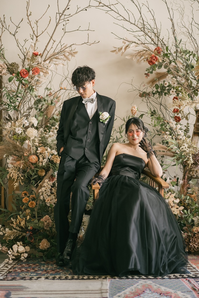 We deliberated a lot about whether to match the color of the tuxedo with the dress or to choose different colors.