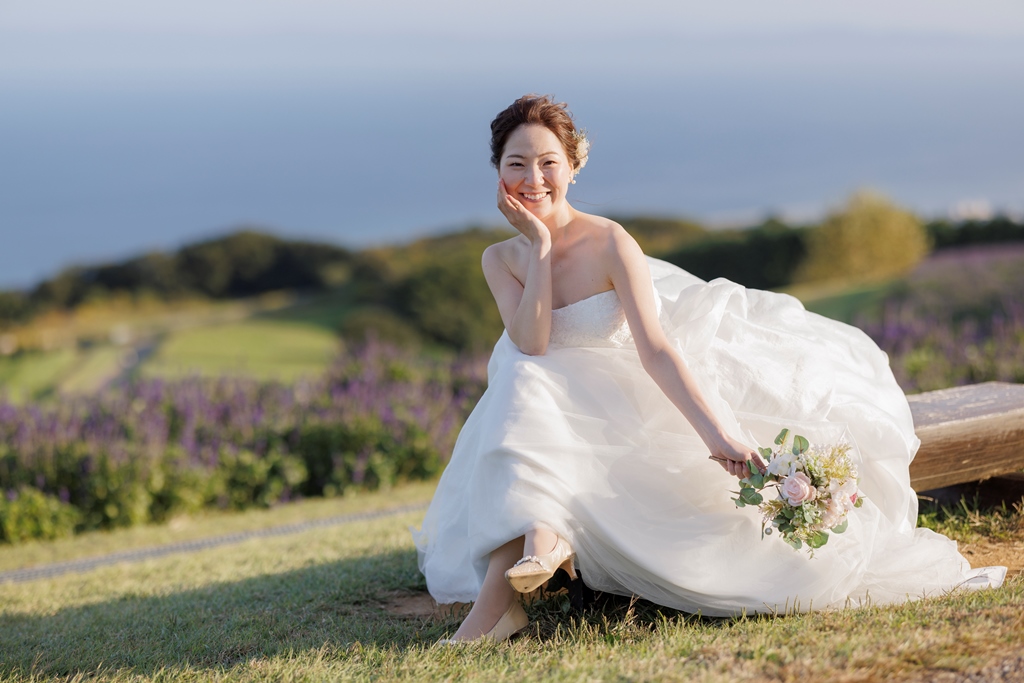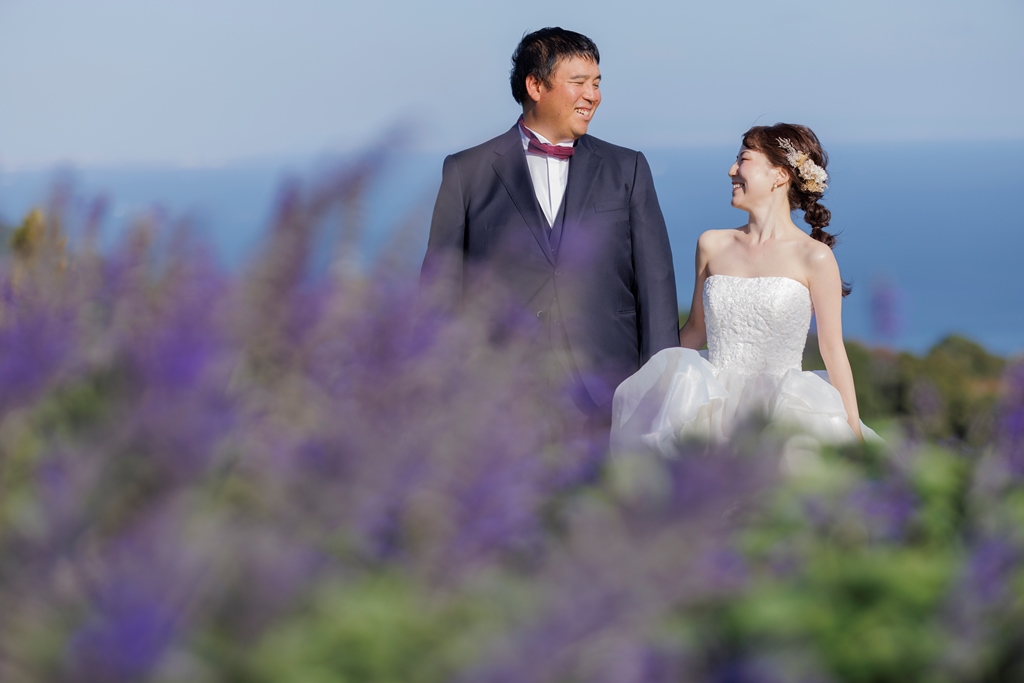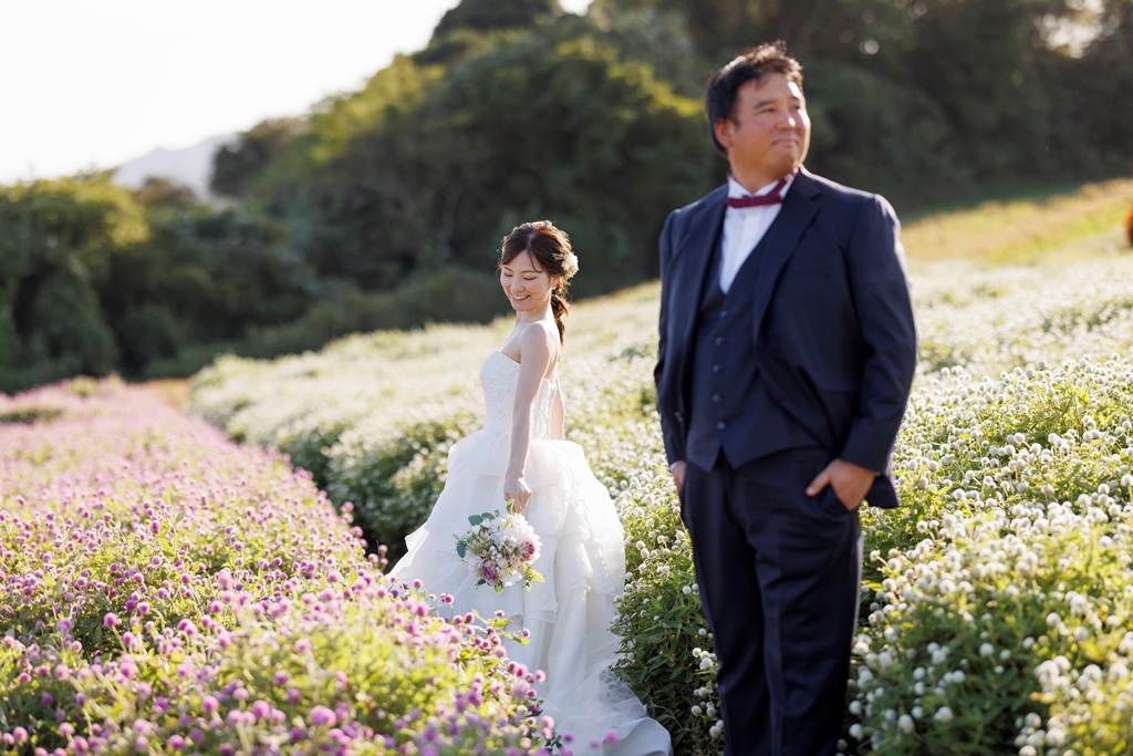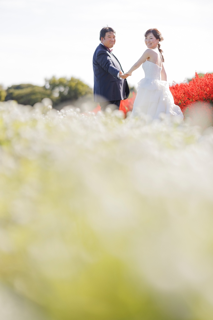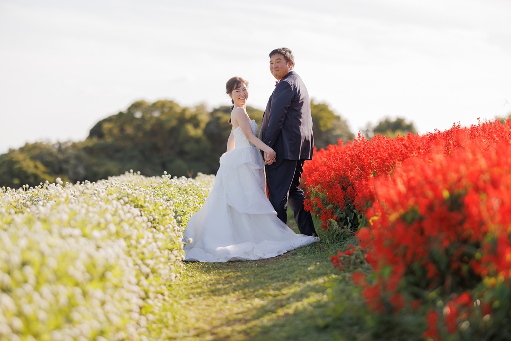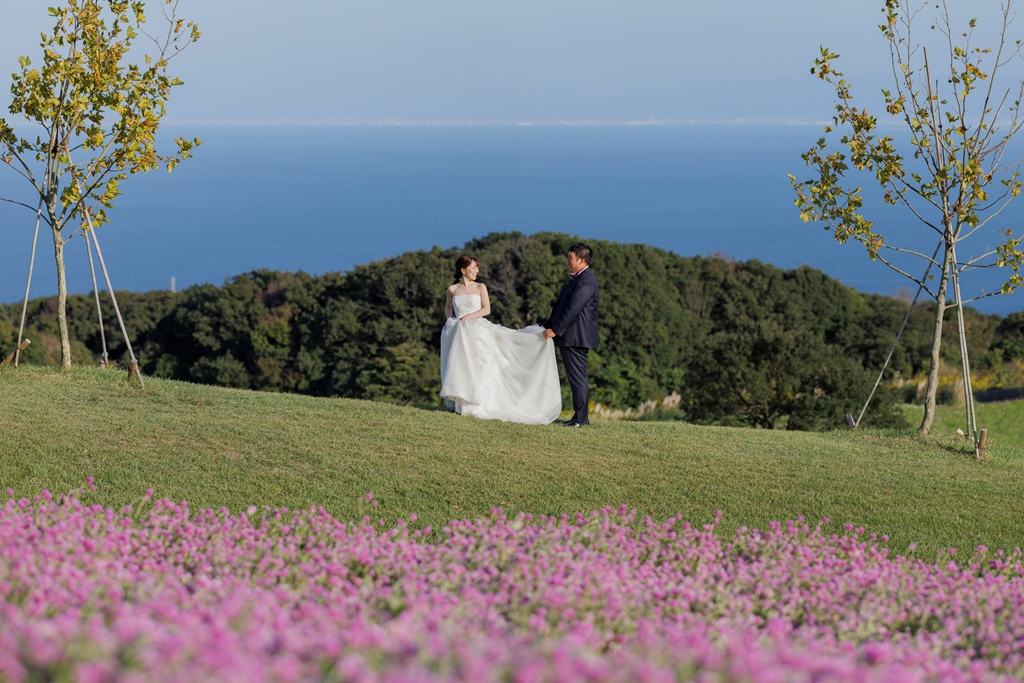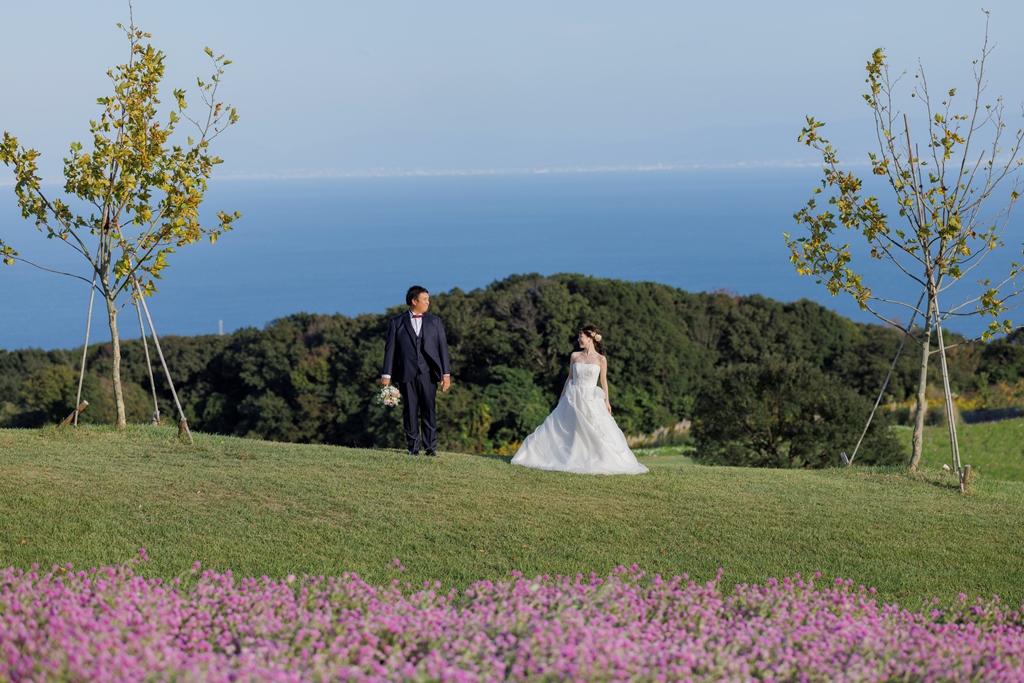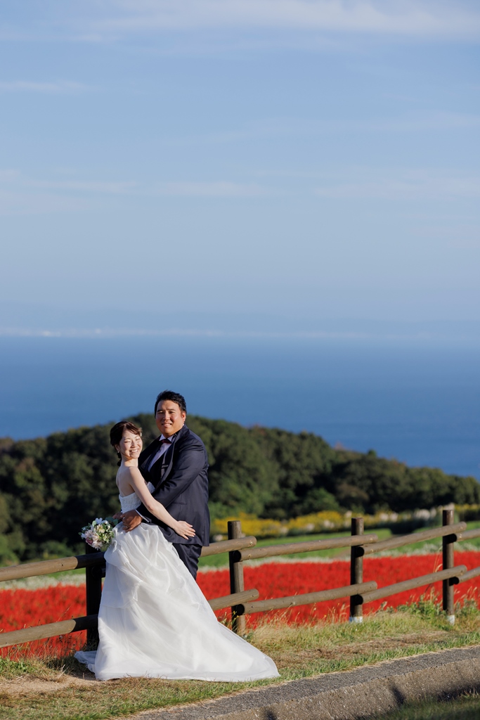 The wedding photos were taken in a beautiful location with blue skies, the sea, and flowers, and it was a day to remember☺.