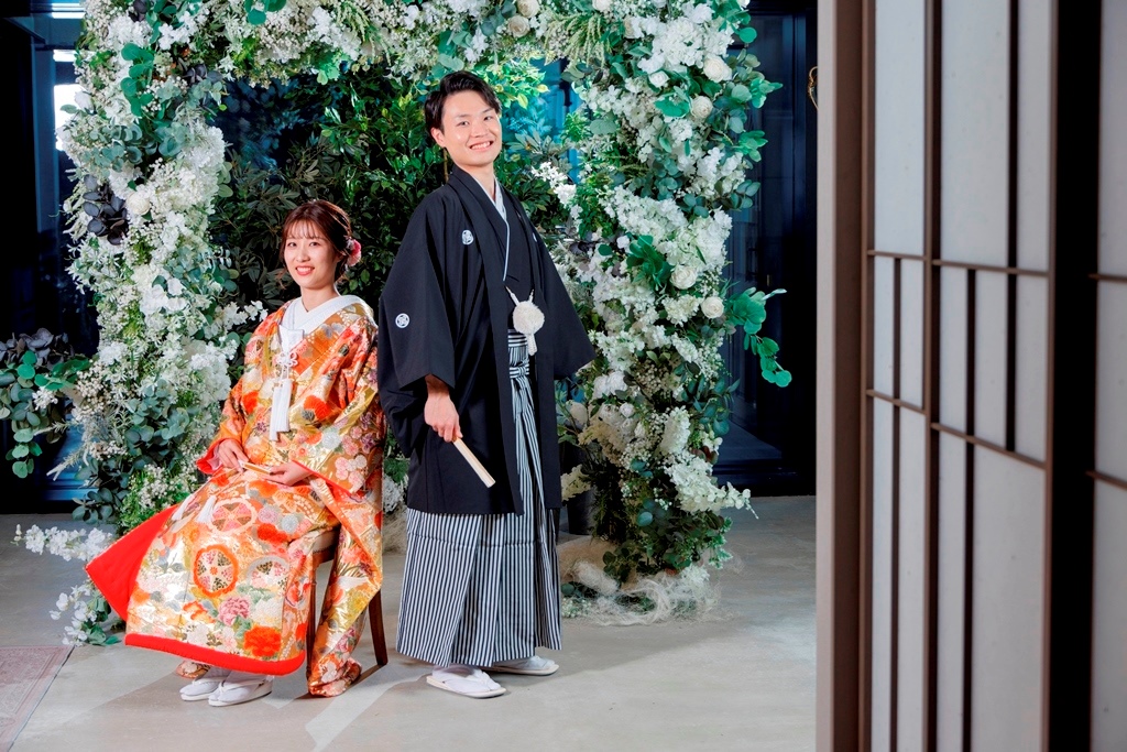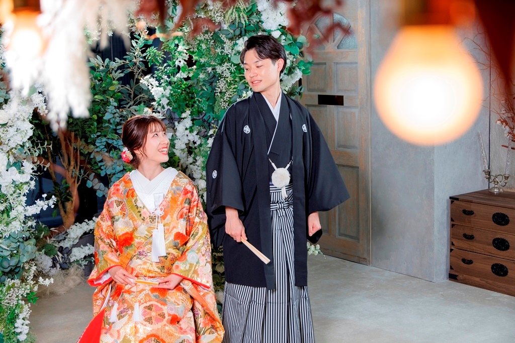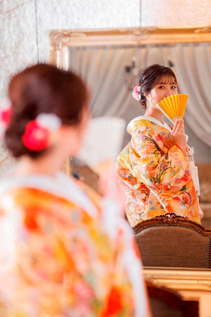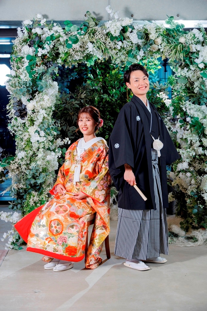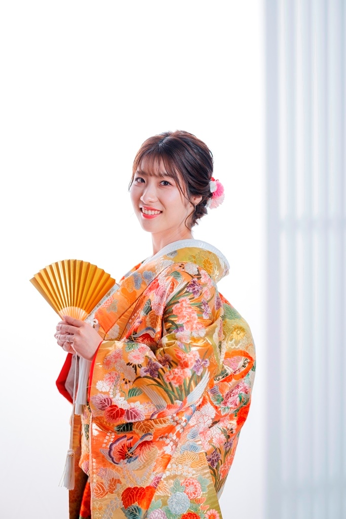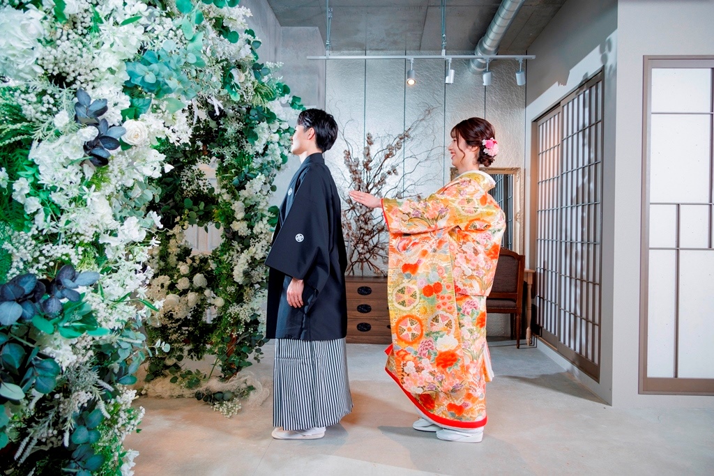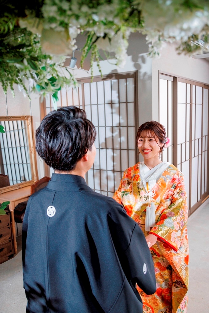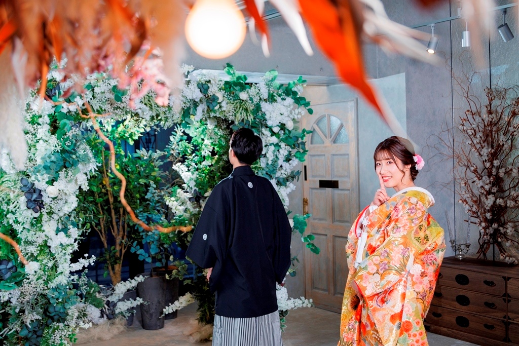 The color of the colored wedding kimono is so gorgeous and cute with the flowers in the studio ☺.The color of the colored kimono is so gorgeous and cute with the flowers in the studio ♡.