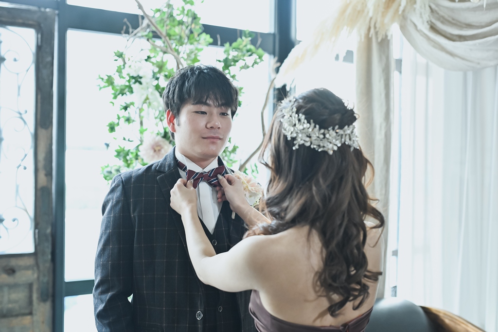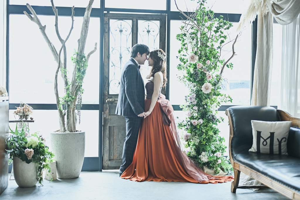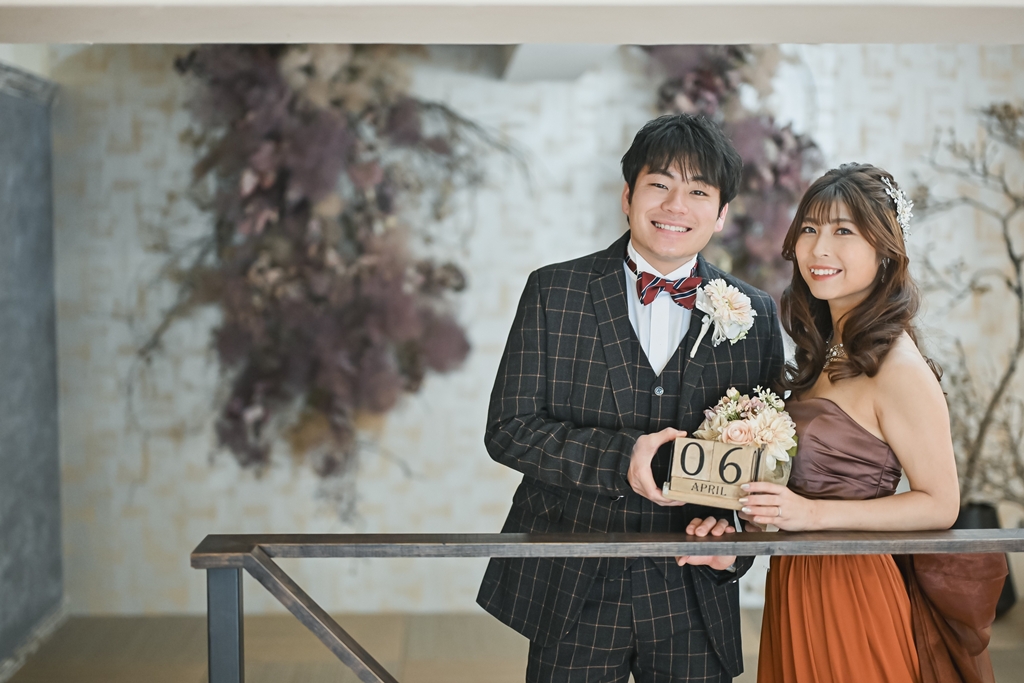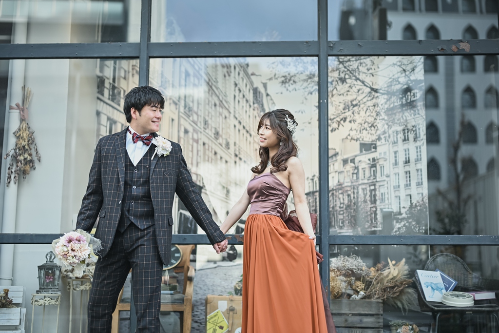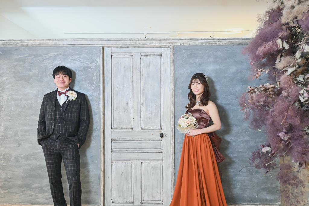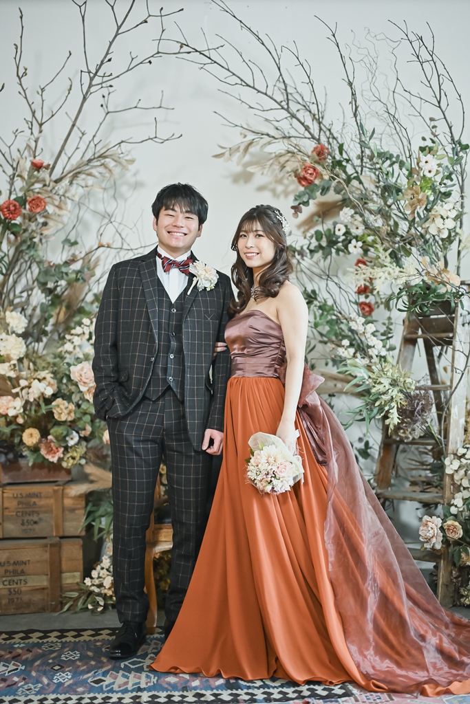 The groom’s tuxedo color also matched beautifully with the colorful dress and the studio’s atmosphere, creating a wonderfully coordinated look☆Every photo of the two of you is so stylish!