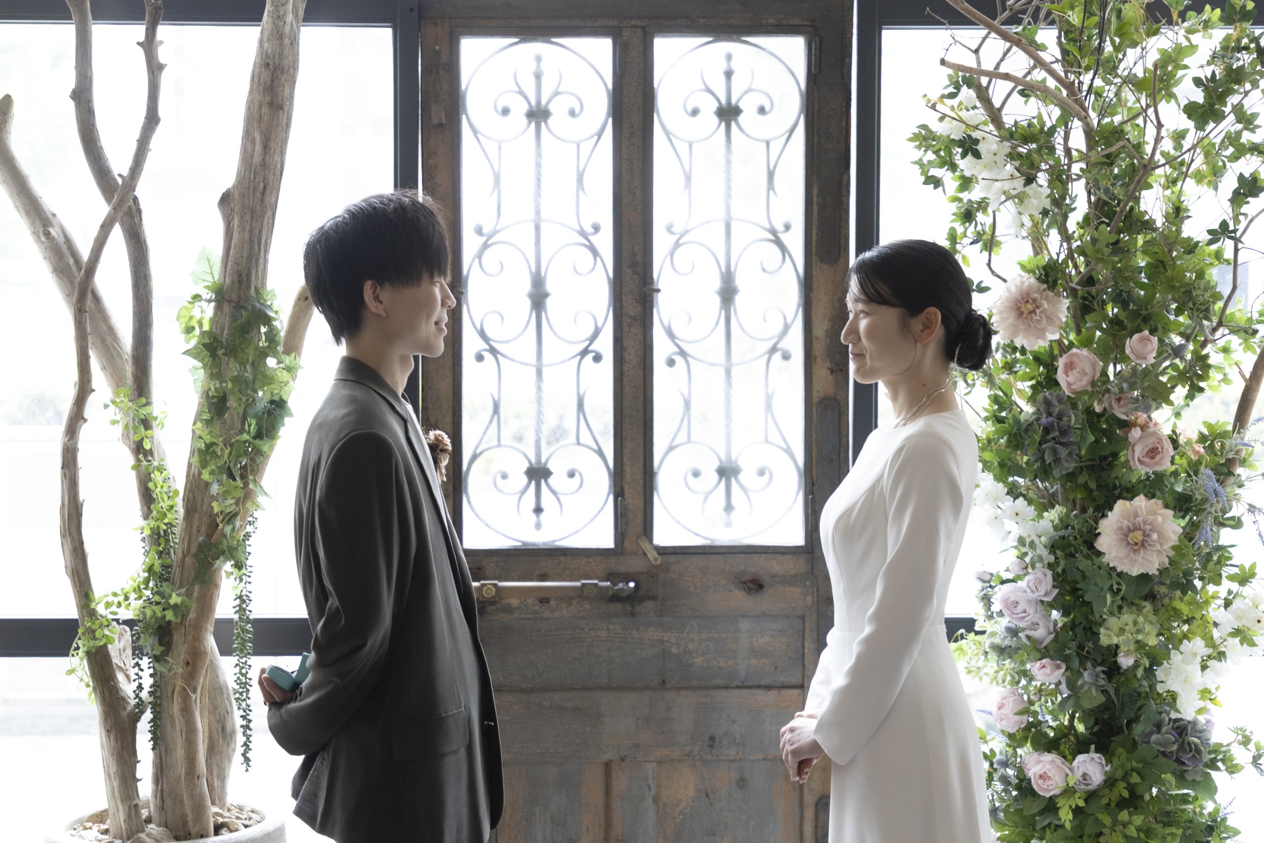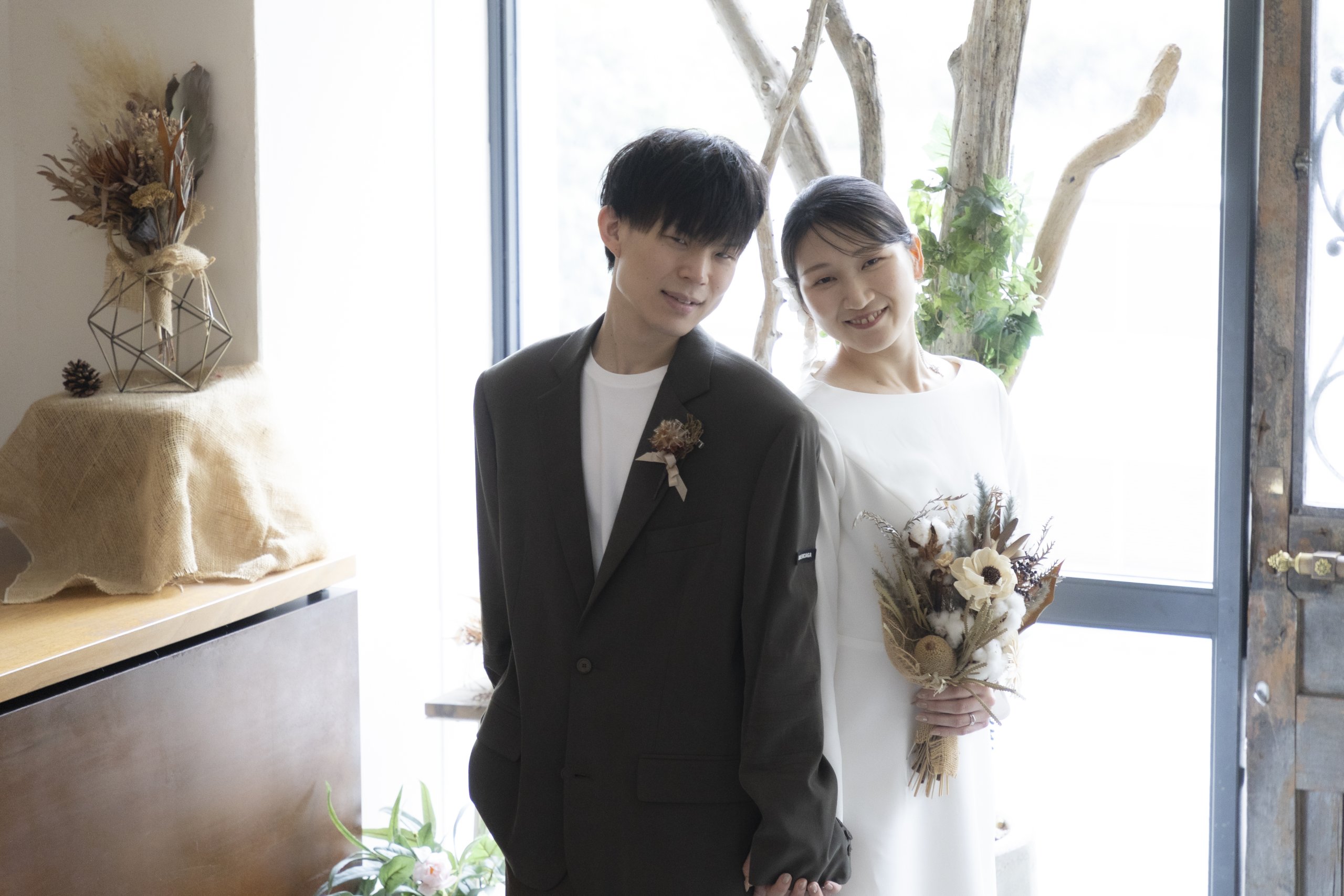 The groom’s calm khakis and the bride’s simple wedding dress were perfect for the mature and relaxed atmosphere of the studio!