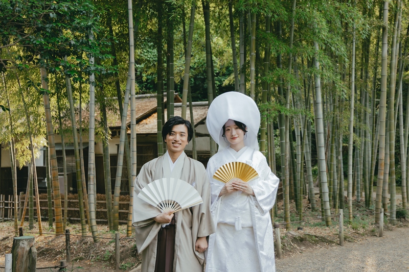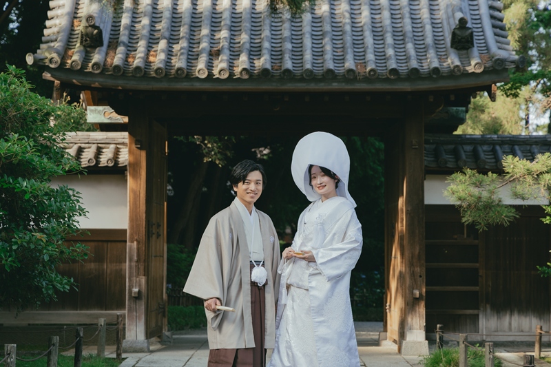 - We chose a beige montsuki and a white shiromuku for our outfits.