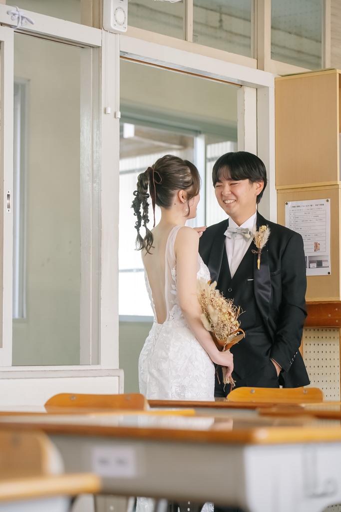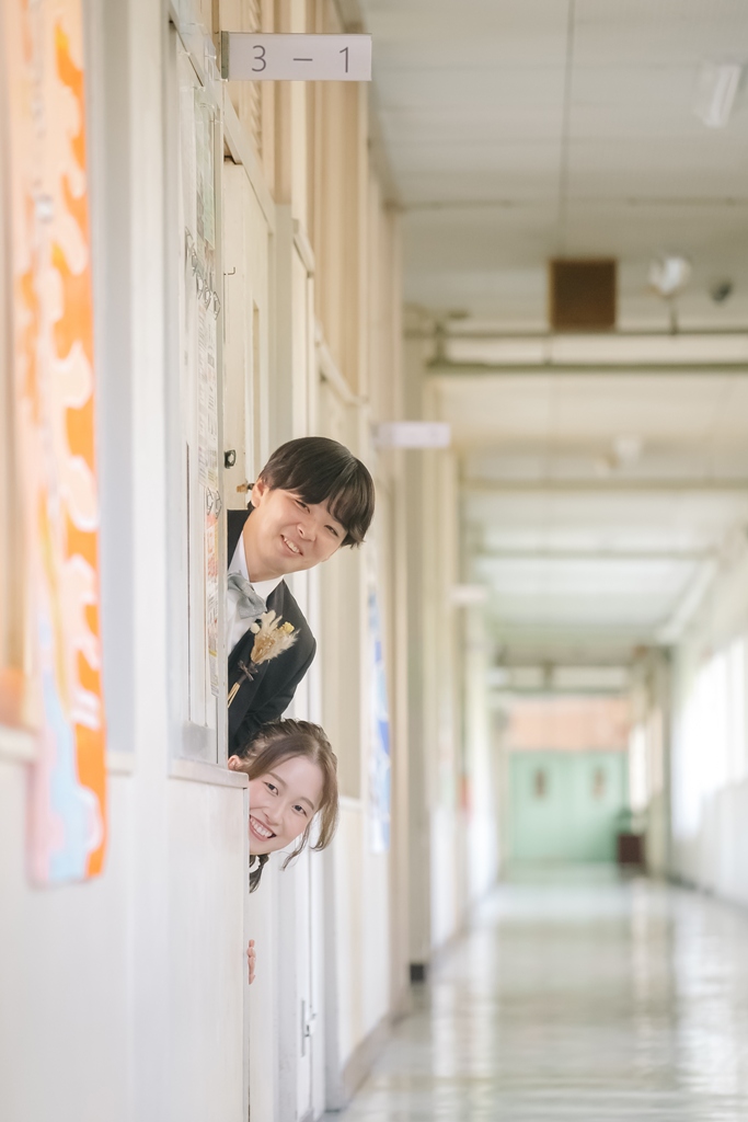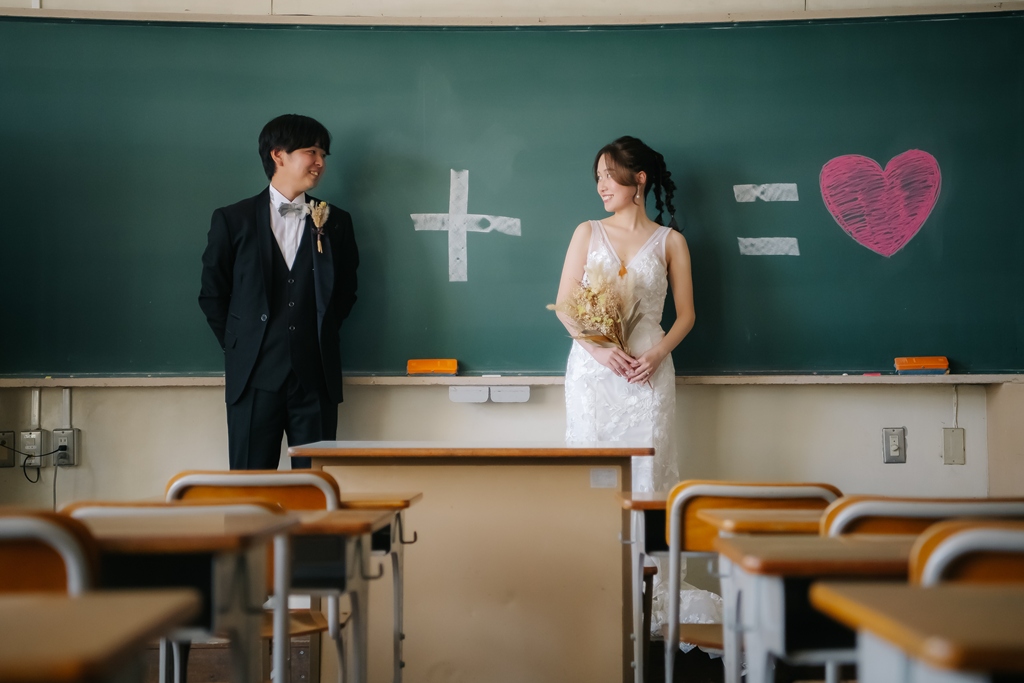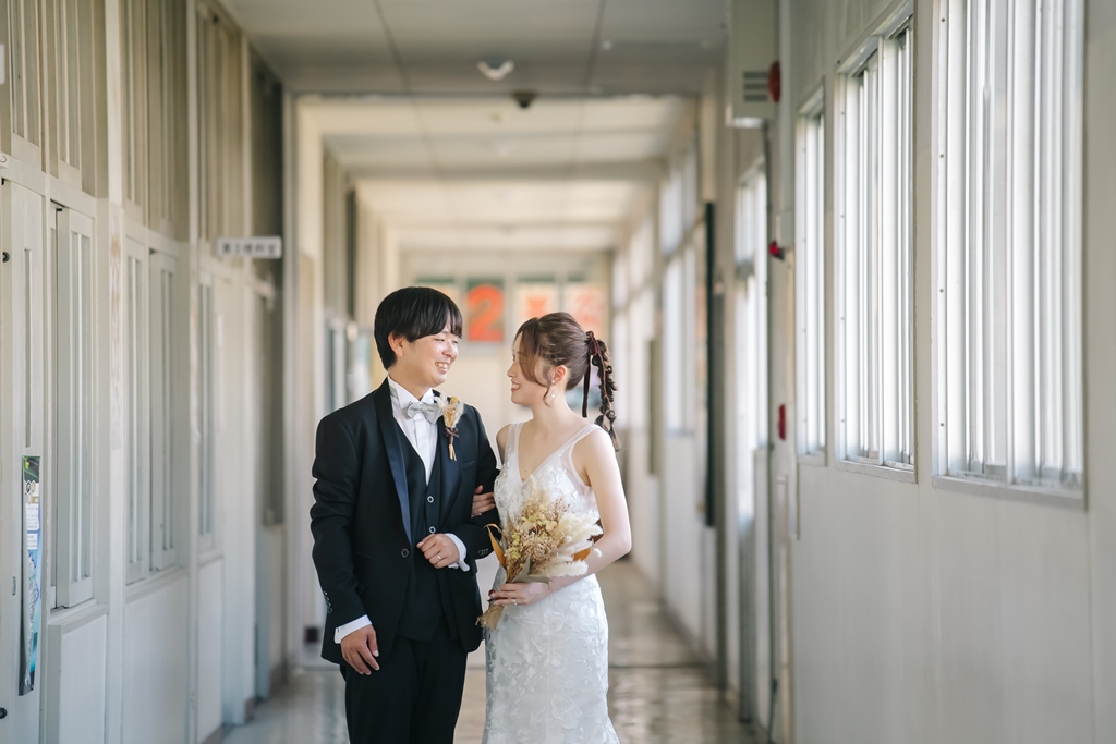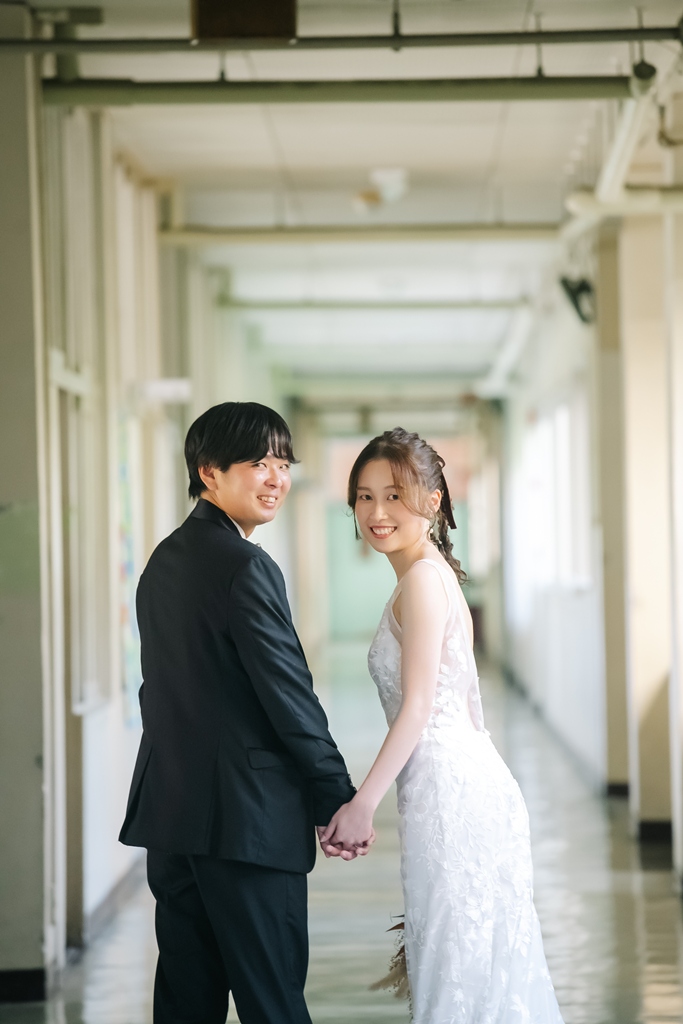 Enjoy the stylish charm of your Western attire to the fullest, while also feeling the warmth that only a memorable location like Agui Junior High School can provide—this truly is a pre-wedding experience unique to you both. Treasure this moment and continue to create countless happy memories together.
