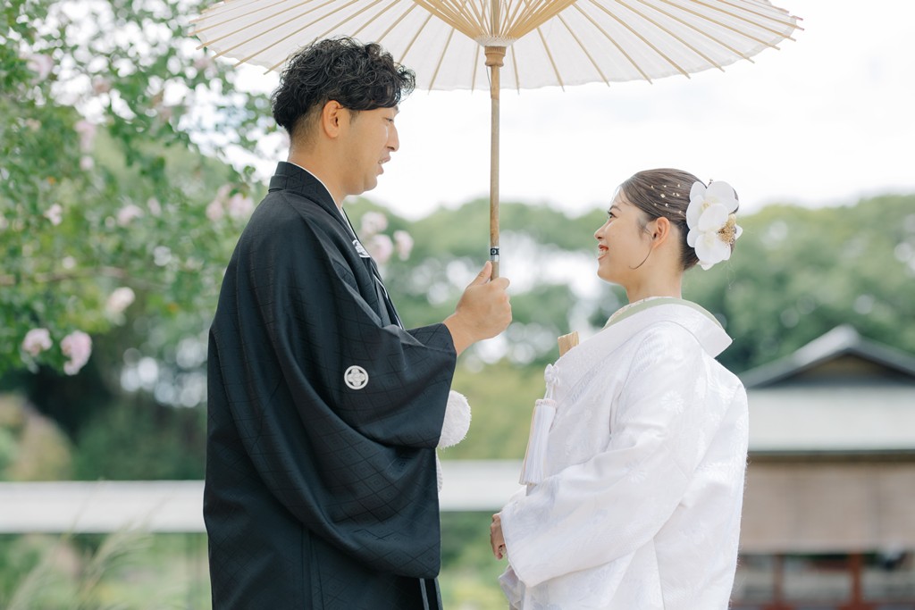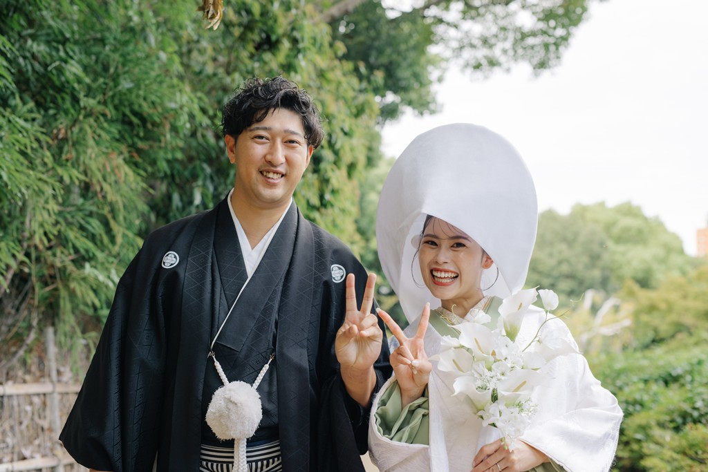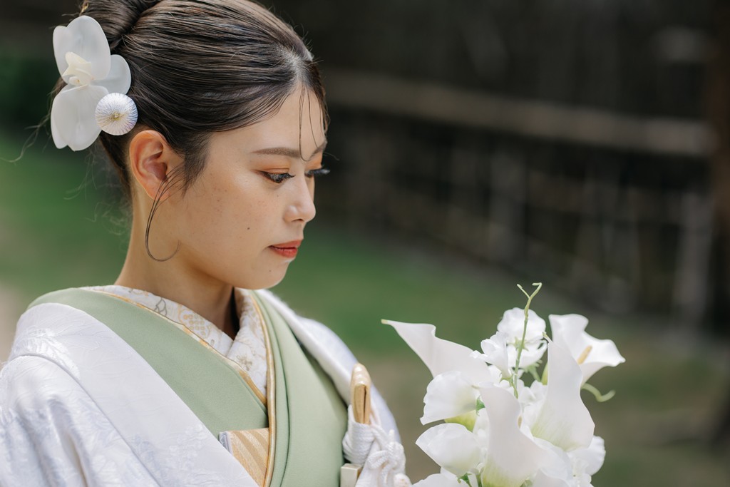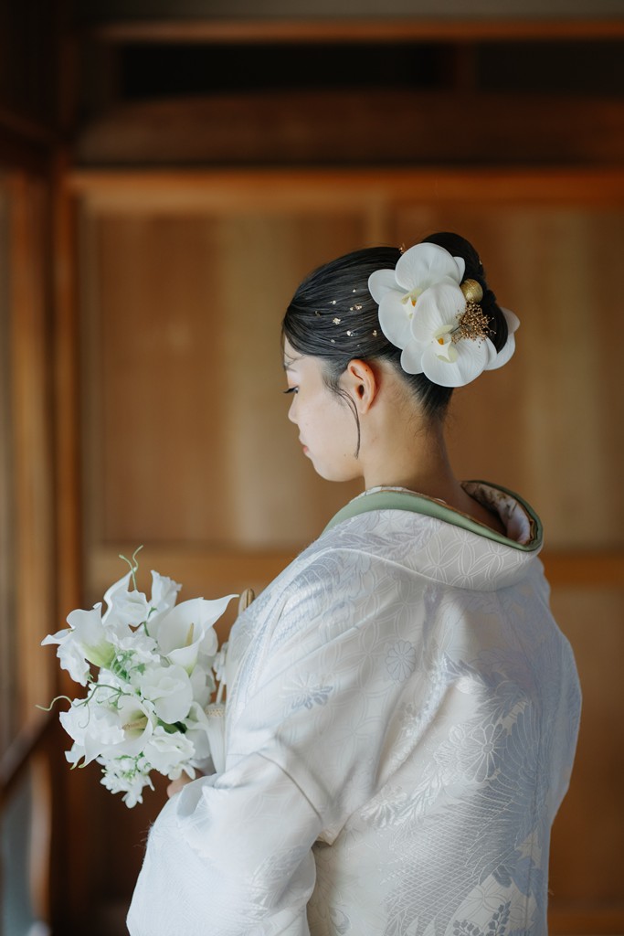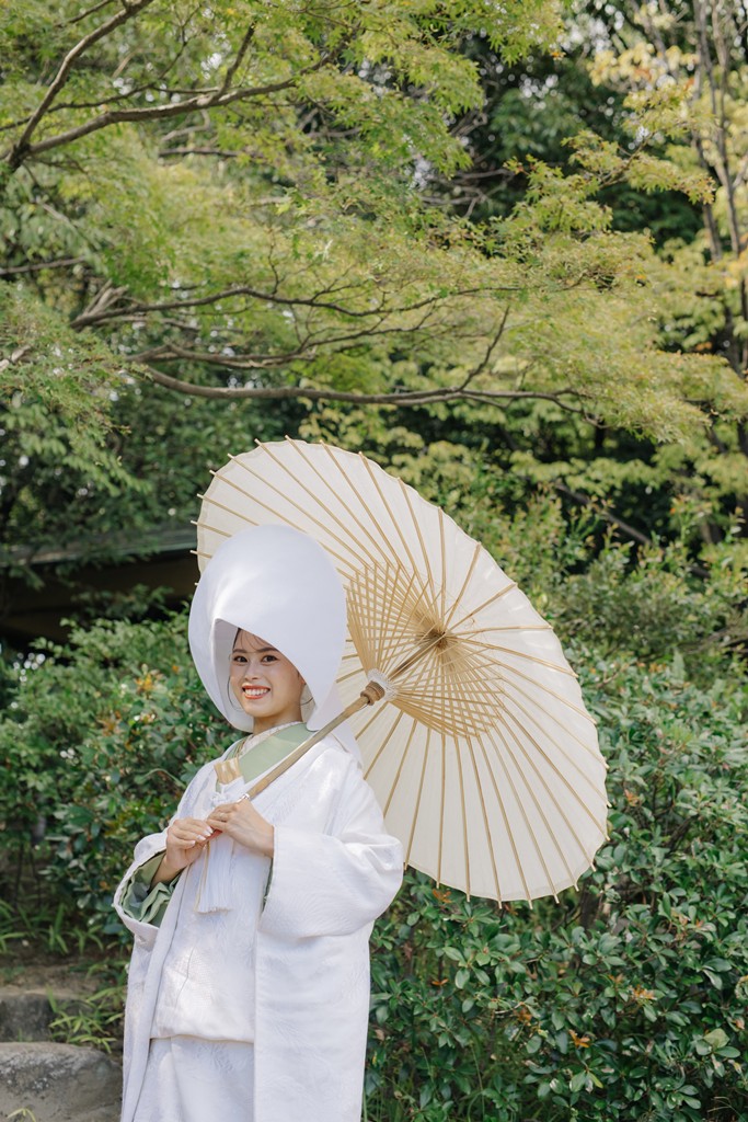 All of us on the staff were deeply moved watching the moments unfold like scenes from a film.The soft white of your shiromuku gently caught the light from the pond, while the vivid colors of the iro-uchikake harmonized perfectly with the garden’s lush greenery.