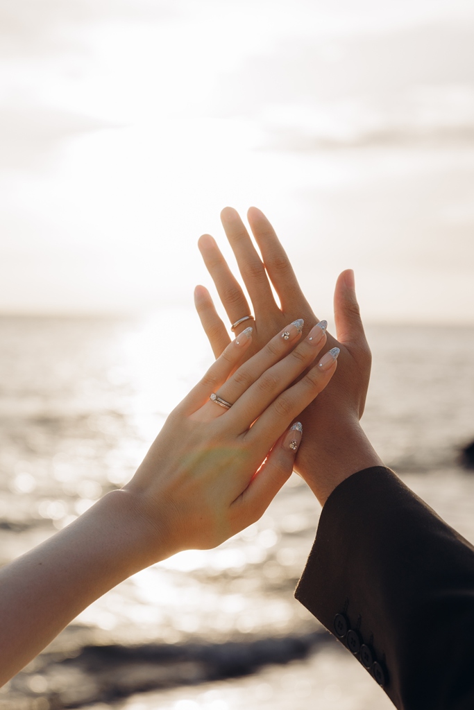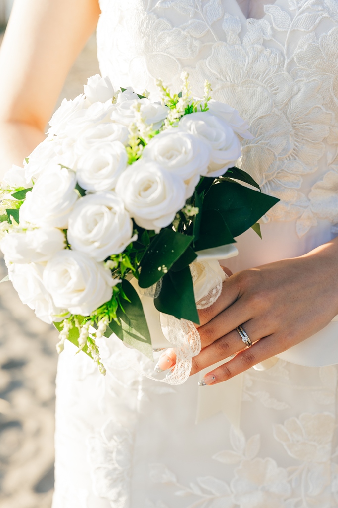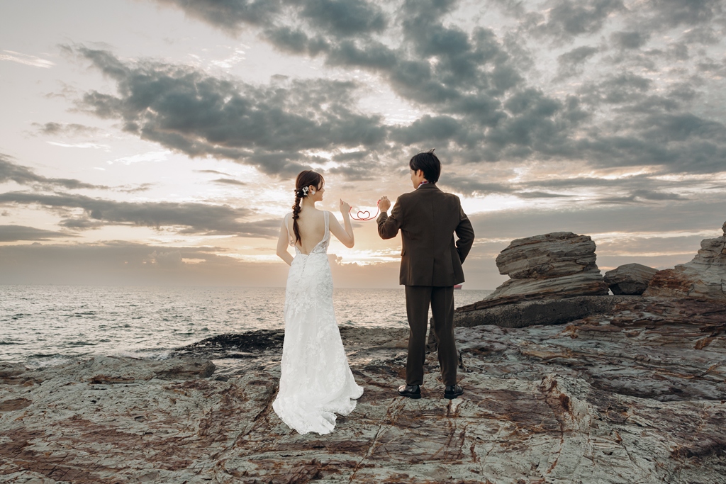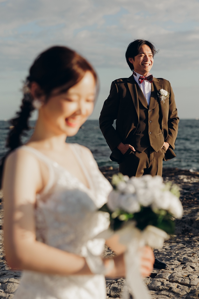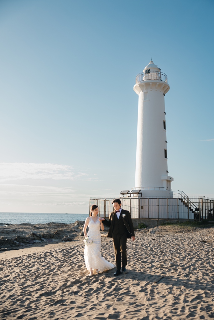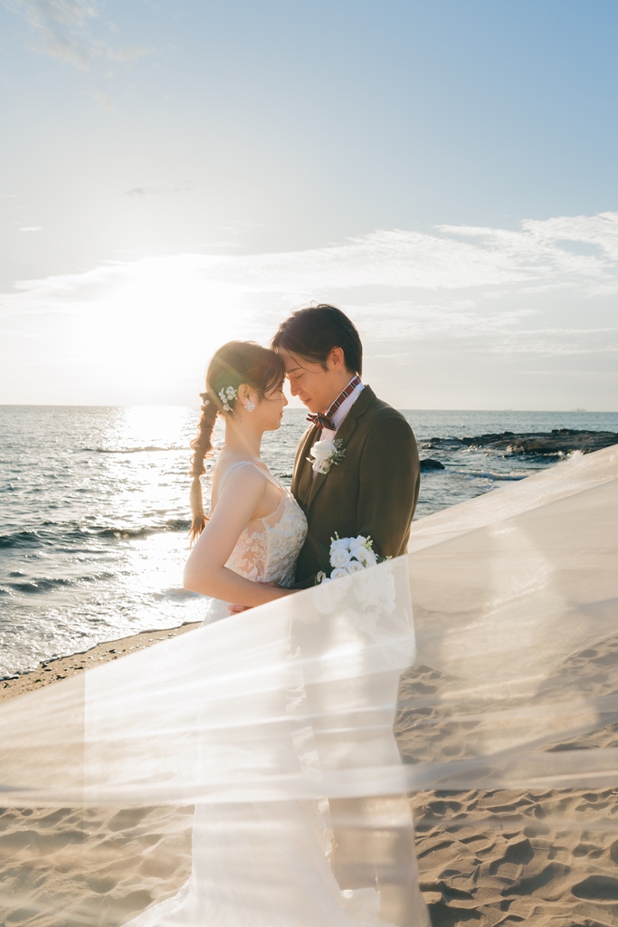 The sound of the waves, the scent of the sea breeze, and the comfortable natural light all blended together to warmly embrace your special day.On the day of the shoot, the sight of the two of you walking along the beach in your dress and tuxedo was unforgettable.