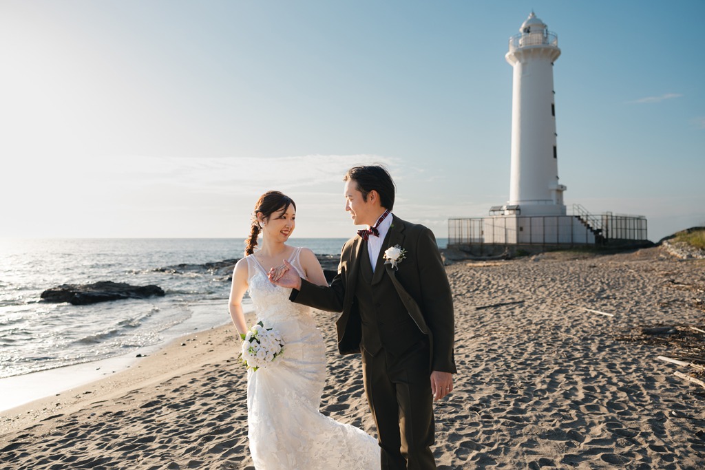 With its gentle waves and soft white sand, Utsumi is a truly special location where Western attire looks exceptionally beautiful.