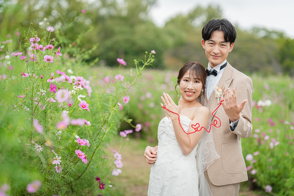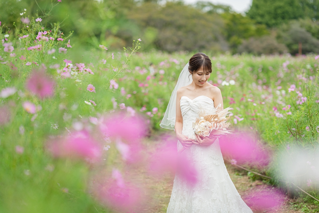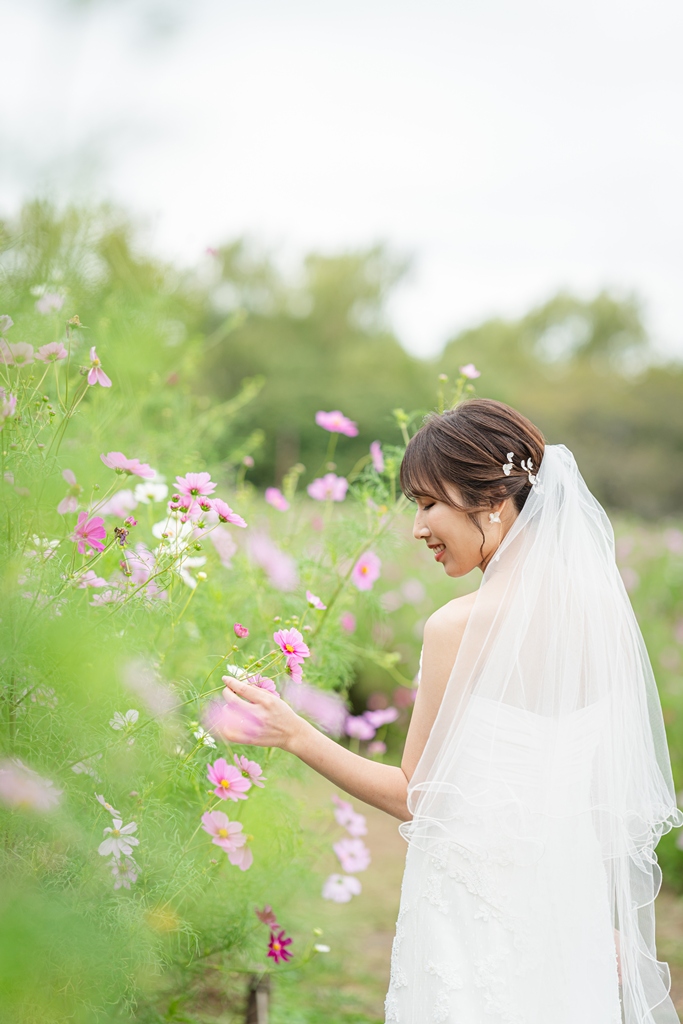 We wanted natural, nature-filled photos featuring cosmos flowers and zelkova trees, so we chose Showa Kinen Park as our location. - FROM